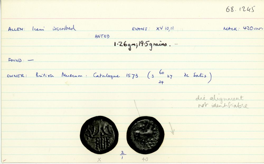 - ANT: Horse right, large oval head with pellet for eye, reversed S below head, corn-ear mane, two pellets below tail, pelleted sun above, pellet triad (see note) and ANT monogram below